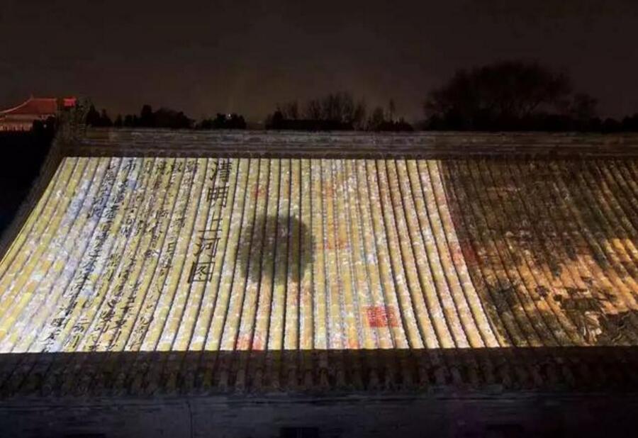 此次夜游故宮最精彩的地方,莫過于從東北角樓帶神武門的這一塊區(qū)域了。光與影將《清明上河圖》和《千里江山圖》等畫卷投影于大殿屋頂上,或如展開的折扇,或如綠色的屏障,耳邊還應(yīng)景地回蕩著叫賣、搖櫓等聲音,古畫的意境與屋瓦融為一體,靈動異常,仿佛人在畫中游。