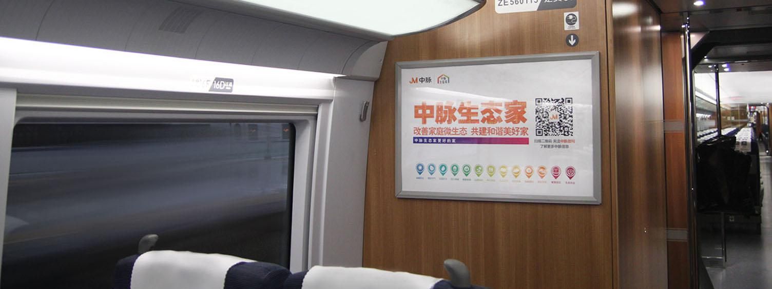 位于所有高鐵車廂內(nèi)行李架下方,對稱發(fā)布,氣勢磅礴,視覺沖擊力強(qiáng),無論坐、立、行,都能有絕佳的視覺效果,利于品牌整體性展示。