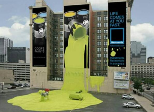美國(guó)全國(guó)保險(xiǎn)公司廣告采用的是戶外立體的大型廣告牌,從圖片中我們可以看出巨大的廣告牌里是不同顏色的油漆,有一桶油漆直接倒了下來(lái),倒在地上,車上,到處都是。如此的廣告牌告訴我們,走在路上油漆桶都有可能倒下來(lái),這種事情我們絕對(duì)提前預(yù)知不到,為了我們的生命安全,我們要多注意,更重要的是還是多買份保險(xiǎn),意外天天都有,災(zāi)難隨時(shí)回來(lái),買份保險(xiǎn)才是真道理。