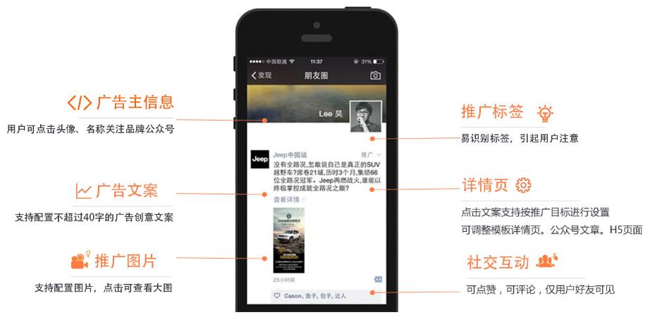 朋友圈廣告將會通過微信廣告系統(tǒng)進行投放和管理,廣告本身內(nèi)容將基于微信公眾賬號生態(tài)體系,以類似朋友的原創(chuàng)內(nèi)容形式進行展現(xiàn),在基于微信用戶畫像進行定向的同時,依托關(guān)系鏈進行互動傳播。