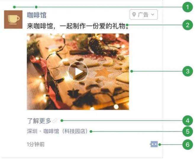 3. 外層小視頻:時(shí)長(zhǎng) 6~15秒 的小視頻,視頻比例為 4:3或16:9;4.文字鏈;5.門(mén)店標(biāo)識(shí)(有線(xiàn)下門(mén)店可選擇展示);6.用戶(hù)社交互動(dòng)。