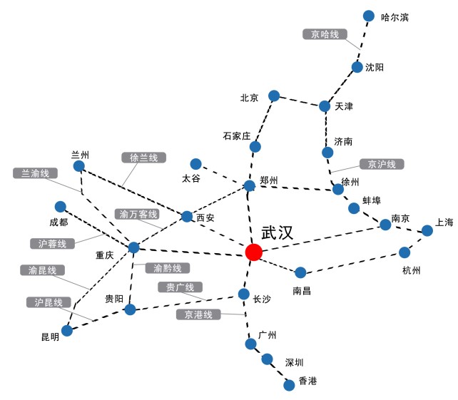 武漢有九省通衢之稱,高鐵網(wǎng)絡(luò)連接大半中國,是中國鐵路系統(tǒng)中重要的大型中轉(zhuǎn)站以及內(nèi)河重要港口,覆蓋全國主要發(fā)達(dá)省市區(qū)和湖北省內(nèi)60%的人口及80%的經(jīng)濟(jì)總量。