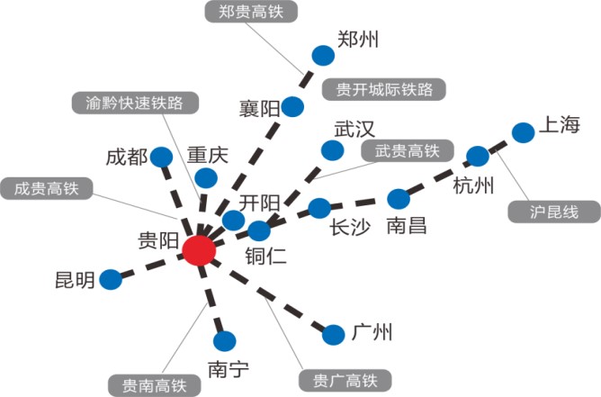 南面貴廣高鐵直接連通珠三角、北部灣,東面滬昆高鐵連通華中和長(zhǎng)三角,西面滬昆高鐵連接云南省,北面渝黔鐵路以及成貴高鐵連通重慶市和四川省。